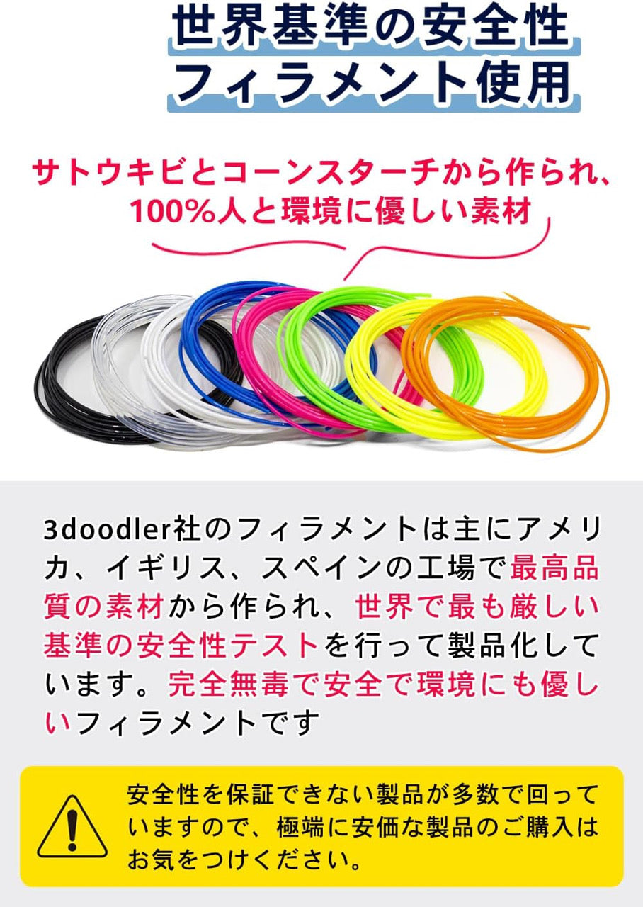 3Doodlerのフィラメントは世界基準の安全テストに合格した最高品質のフィラメントです。